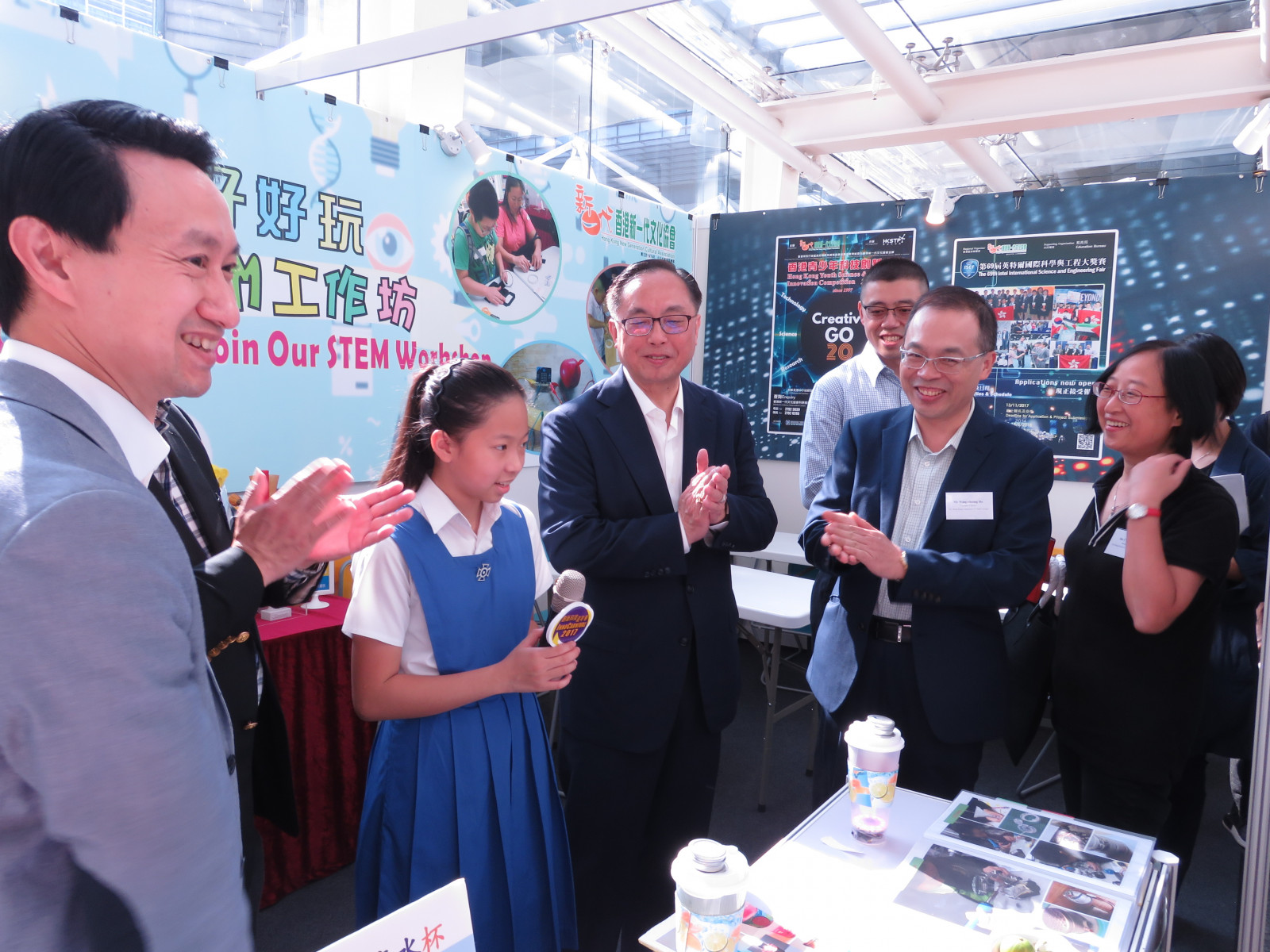 在全國科學比賽勇奪一等獎的鄭琛翹同學向創新及科技局局長楊偉雄先生,GBS,JP及一眾嘉賓介紹其得獎作品「神奇健康水杯」
