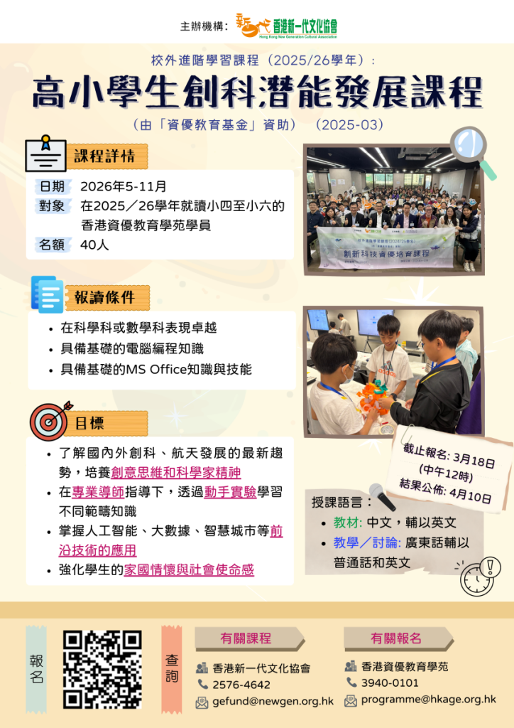 對象:在2025/26學年就讀小四至小六的香港資優教育學苑學員