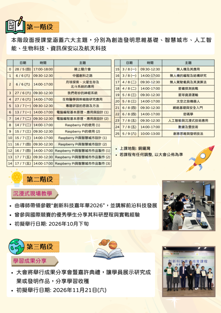 為積極推廣STEAM教育,本會將舉辦「高小學生創科潛能發展課程」,課程旨在為高小學生提供多元而具挑戰性的學習平台,結合創新科技與跨學科知識,啟發創意思維,讓學生充分發揮潛能。課程重視理論與實踐相結合,透過專業導師引導、真實案例研討及動手實驗,協助學生掌握跨學科核心技能,提升解決現實問題的能力,從而在不斷變化的社會環境中靈活應對挑戰,成為推動世界進步的重要力量。