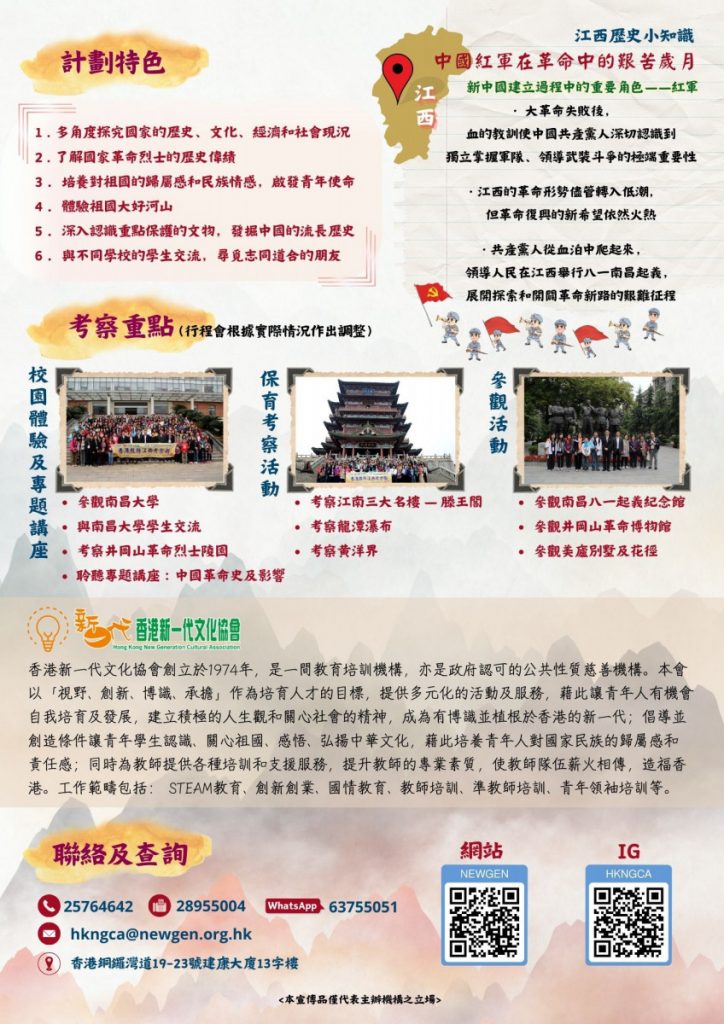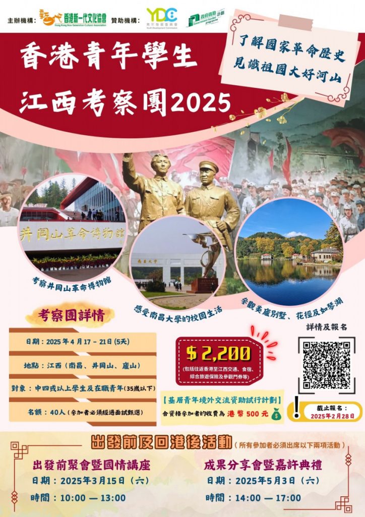1927年,共產黨領導人民在江西舉行八一南昌起義,開啟了探索和開辟革命新路的艱難征程。有鑒於江西對中國革命歷史的巨大意義,本會將於2025年4月繼續為全日制中四或以上學生及35嵗以下在職青年舉辦「香港青年學生江西考察團」。計劃希望透過考察革命歷史遺址,讓參加者對中國紅軍在革命中的艱苦歲月有更深刻的體會,由此加深年輕一代對當代中國歷史的認識。此外,參加者可親身感受黃洋界和龍潭瀑布等江西著名的自然美景,見識祖國的大好河山,並感悟華夏文明的悠久歷史,培植更深厚的民族感情。