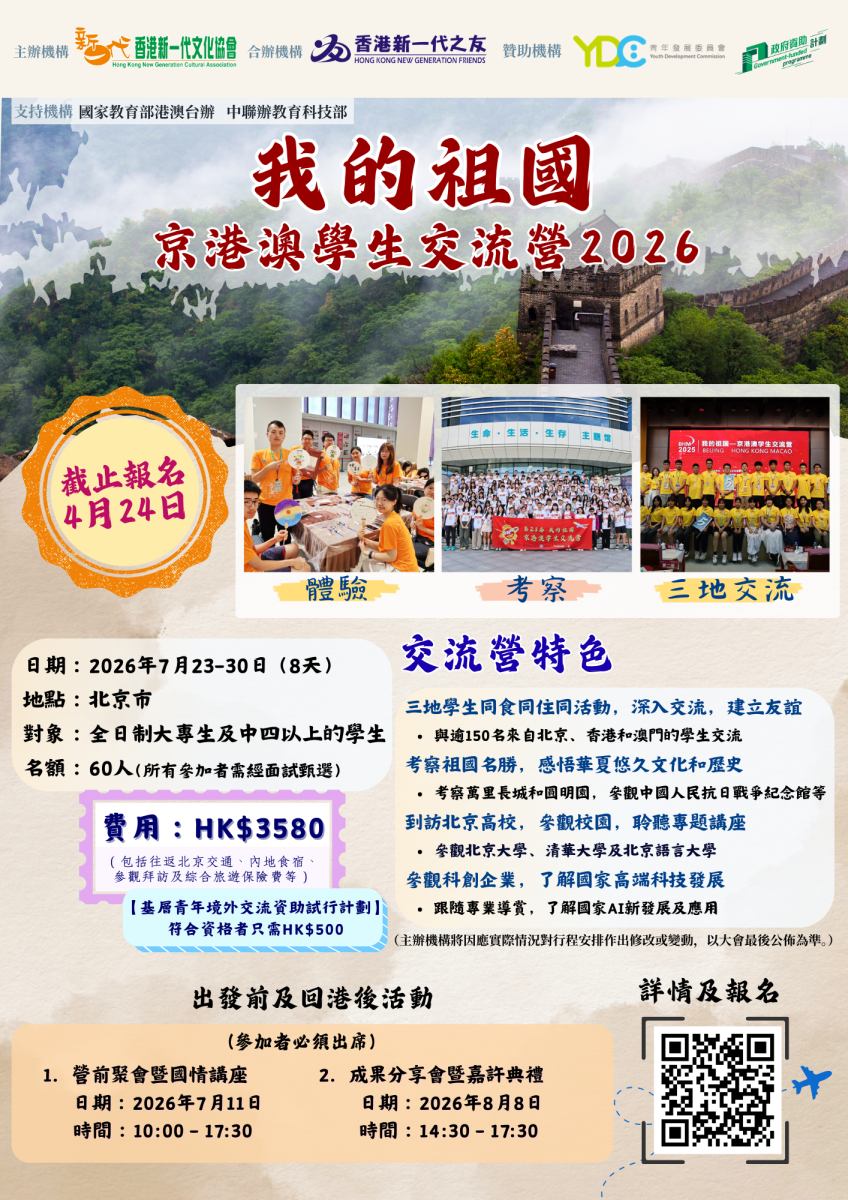 費用:港幣3,580元 (包括:往返香港至北京機票、內地食宿交通、參觀及綜合旅遊保險等)