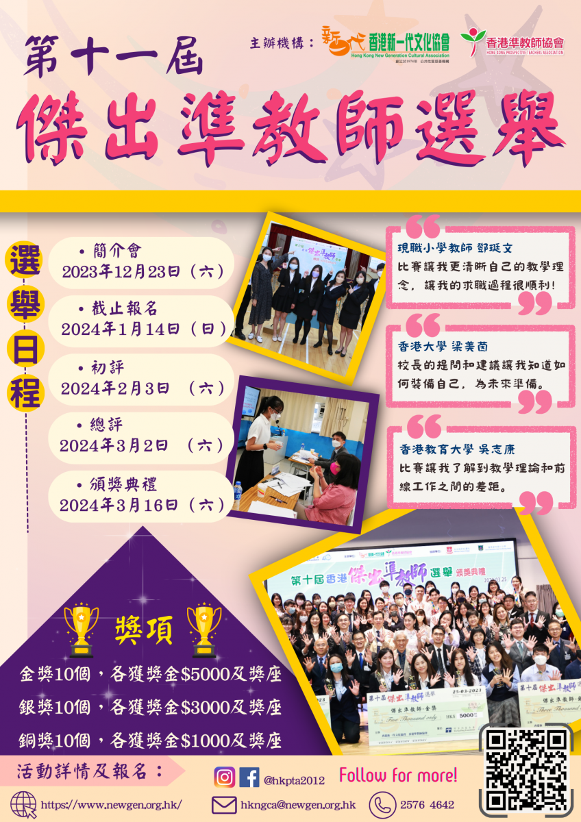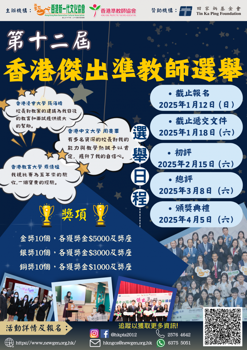 在過去已曾成功舉辦了四屆「香港傑出準教師選舉」,鼓勵準教師向同輩和前輩學習、追求卓越。今年我們再接再厲,繼續舉辦第五屆「香港傑出準教師選舉」,激勵不同院校的準教師裝備自己、精益求精。